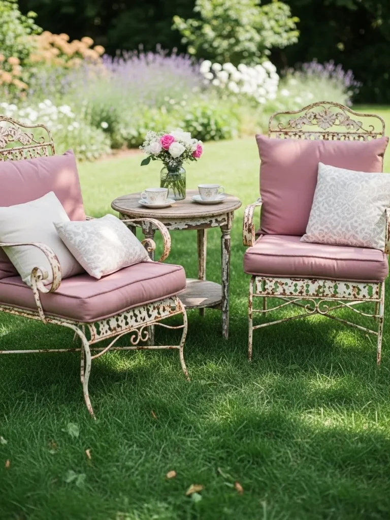 Vintage style chairs with blush cushions are arranged on the grass beside a small round table. Soft pillows and fresh flowers complete the cozy setup. The greenery around it makes the seating area feel tucked away and intimate.