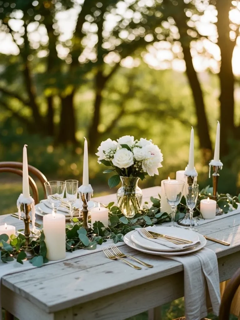A long wooden table is styled with white plates, flowing linens, and tall candles surrounded by greenery. Fresh floral arrangements are placed casually along the center. The light filtering through the trees adds a warm glow.