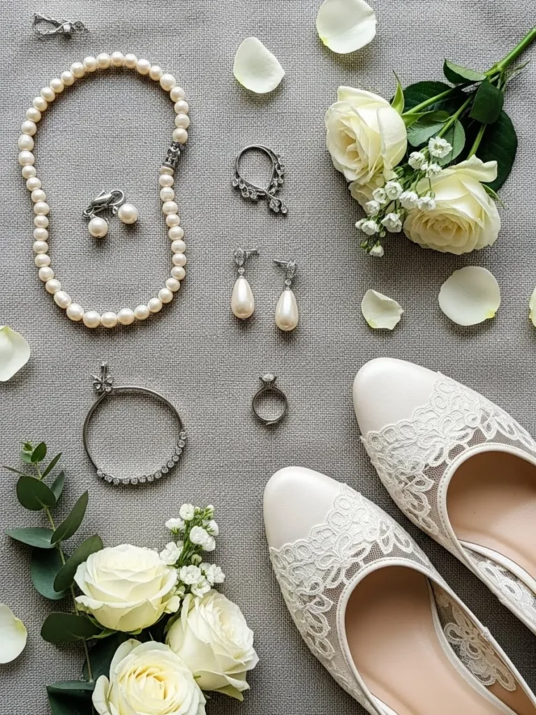 A soft flatlay shows bridal shoes, pearl jewelry, earrings, and delicate floral accents arranged on neutral fabric. White roses and scattered petals add texture and romance. The overall palette feels calm, elegant, and very garden inspired.