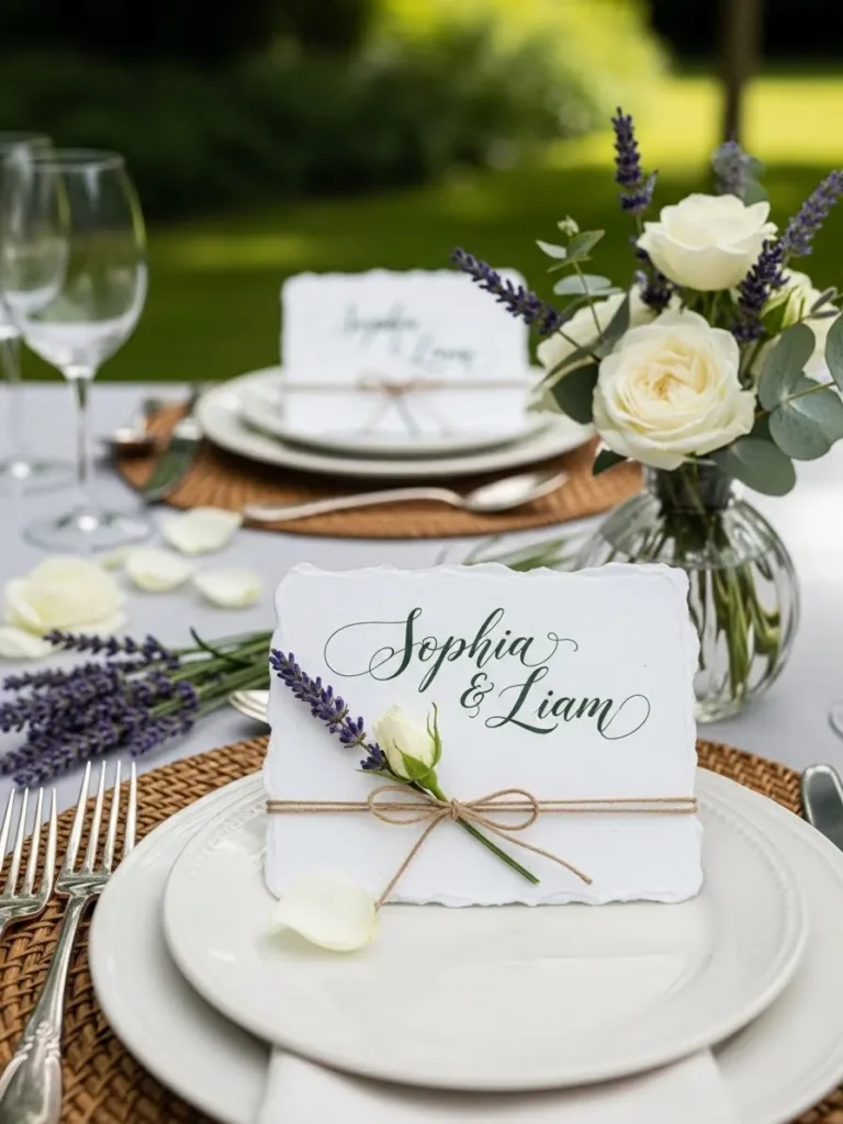 A styled place setting features layered plates, natural linens, and handwritten name cards tucked into floral accents. Lavender and greenery add a subtle pop of color. Everything feels carefully arranged yet relaxed.