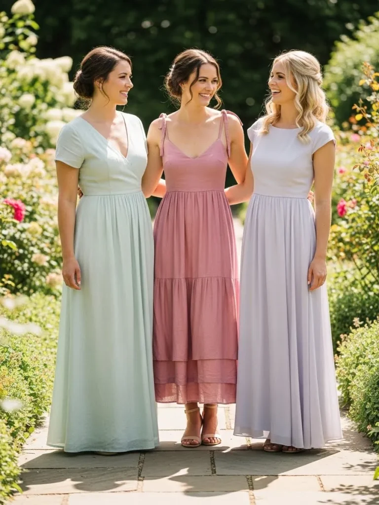 Three bridesmaids stand together wearing flowing pastel dresses in soft green, blush pink, and lavender. Each dress has its own subtle silhouette while still feeling cohesive as a group. The colors pop gently against the garden flowers without stealing attention from the bride.
