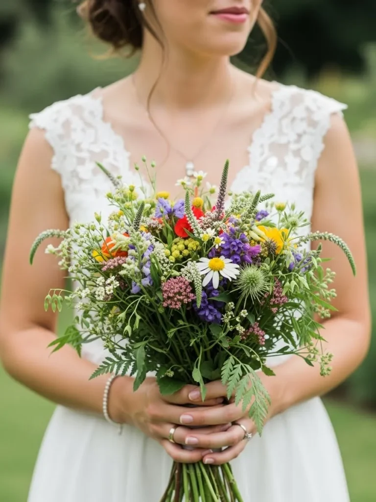 The bride holds a loose wildflower bouquet filled with colorful blooms and natural greenery. The flowers feel freshly gathered with a relaxed shape and organic movement. It pairs beautifully with the simple lace wedding dress.