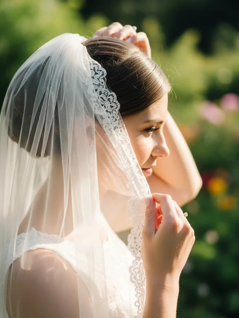 The bride is captured in profile adjusting a sheer veil that softly frames her face. The lace edge adds delicate detail while the sunlight filters through the fabric. Her hair is styled neatly back which lets the veil take center stage against the lush garden backdrop.