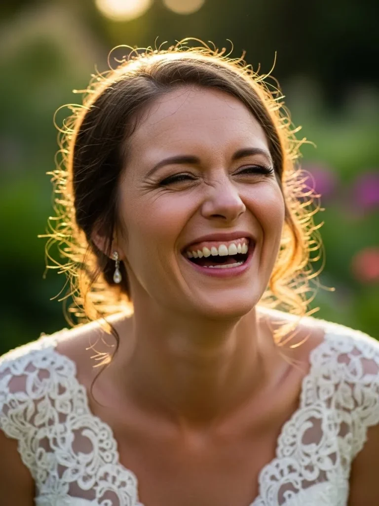 The bride is shown laughing openly with soft curls framing her face. Her lace dress adds texture while the greenery around her enhances the warm joyful mood. The candid expression makes the entire image feel alive and heartfelt.