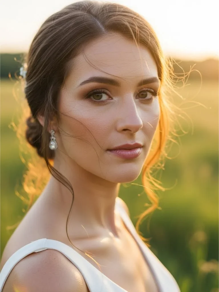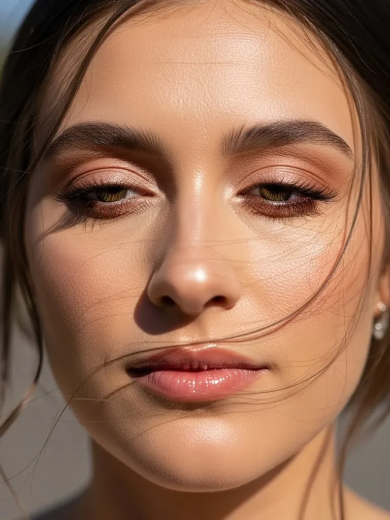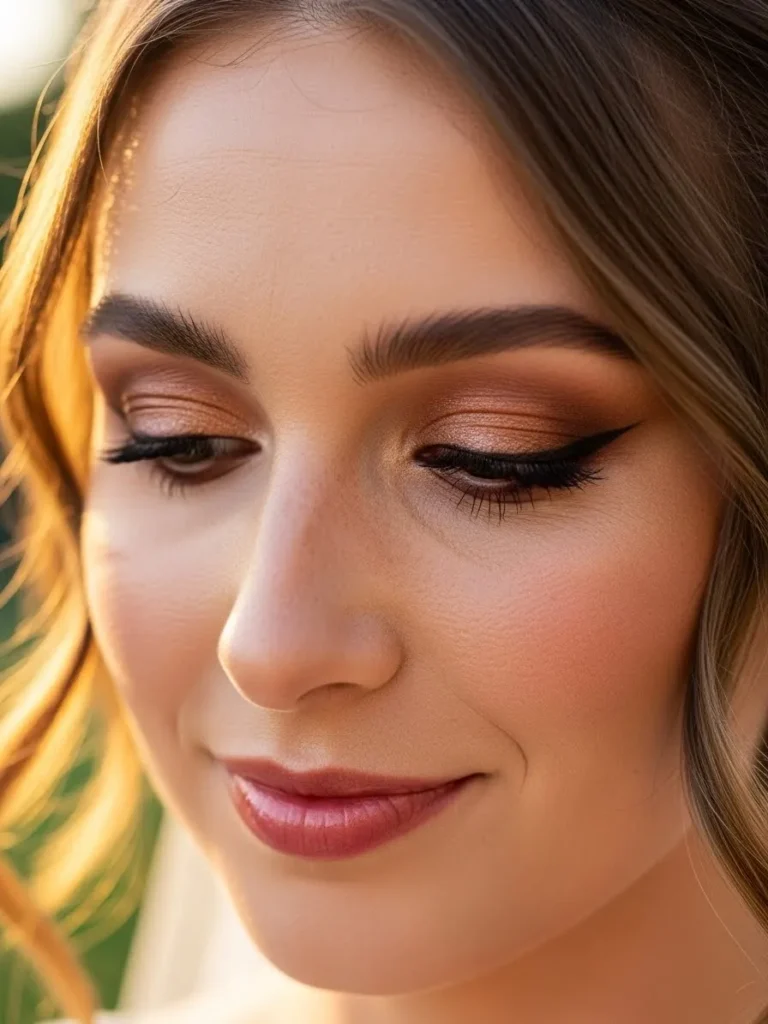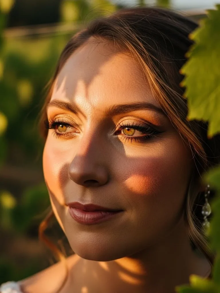 Her makeup is softly sculpted with warm bronze eyeshadow blended seamlessly into the crease and a gentle glow across the cheekbones. The skin looks radiant and healthy with a satin finish that reflects the sunlight in the most flattering way. A neutral lip ties everything together and keeps the look timeless and calm.