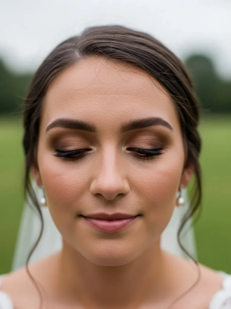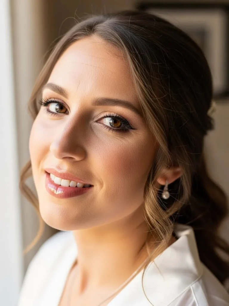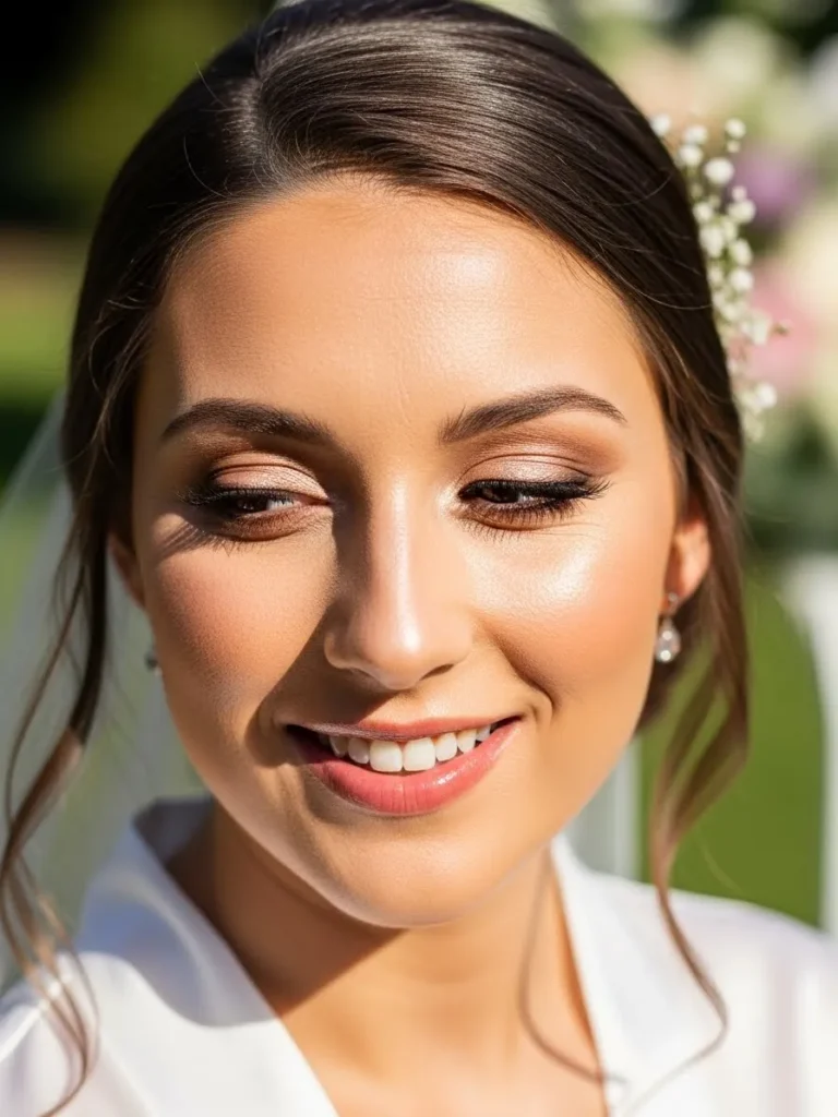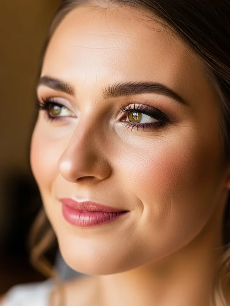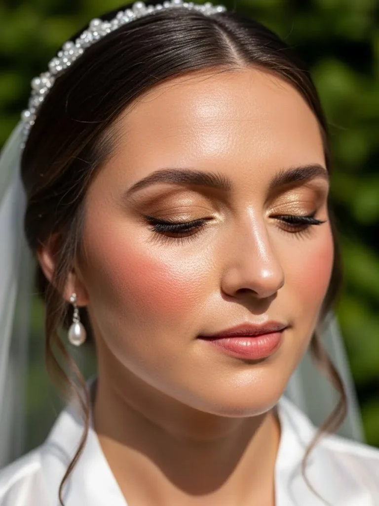 Her makeup is smooth and refined with warm neutral eyeshadow softly blended across the lids and a subtle shimmer that catches the light. The skin looks even and luminous with a soft flush on the cheeks and a natural pink lip. Everything feels calm and beautifully balanced.