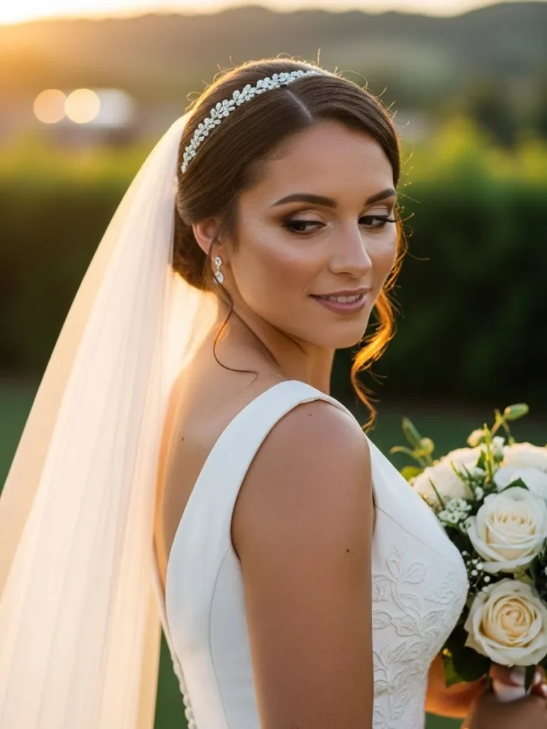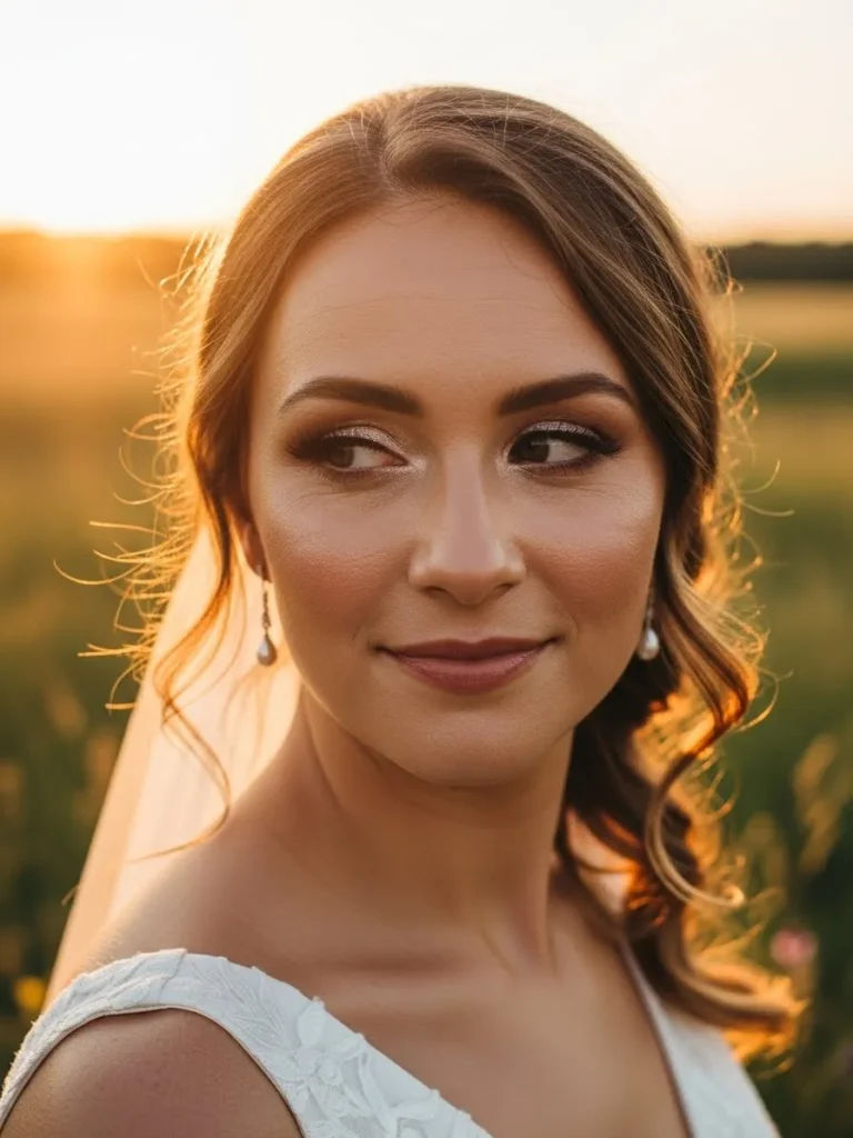 The makeup features warm bronze tones on the eyes, softly defined lashes, and glowing skin that looks radiant in the evening sun. The blush adds warmth and the lips stay soft and neutral. Paired with the veil and bouquet, the look feels romantic and polished.