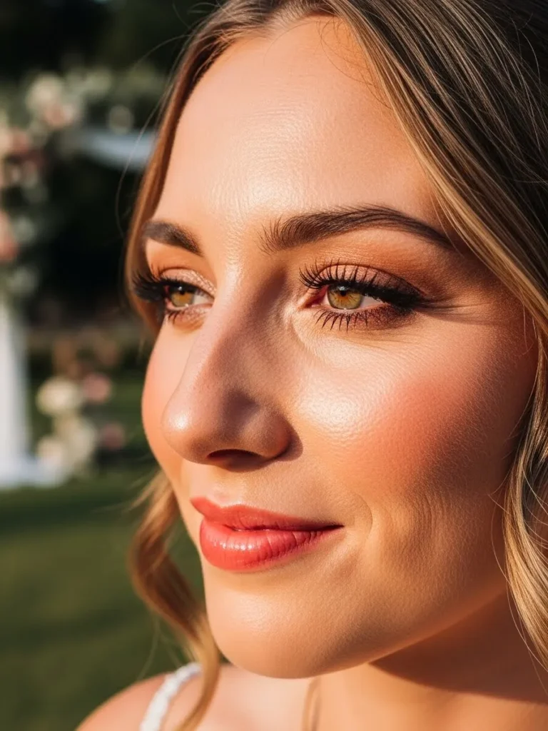 I love how glowing and feminine this look feels. It has that soft glam magic that looks incredible in sunlight. This is perfect for brides who want warmth, radiance, and a little extra sparkle without going too bold.