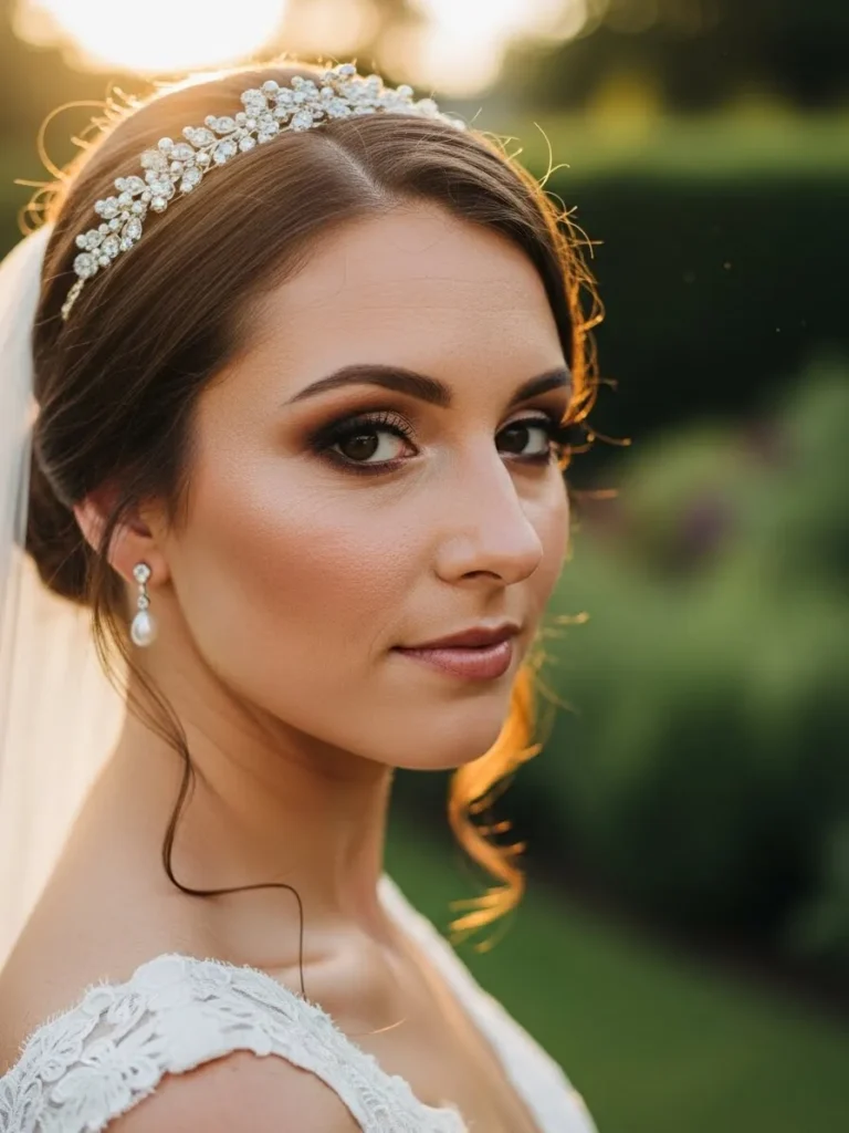 Her eyes are softly defined with warm tones and a smooth blend that gives depth without harsh lines. The complexion has a gentle glow and the lips are neutral and polished. The makeup pairs beautifully with the delicate headpiece and soft hairstyle.