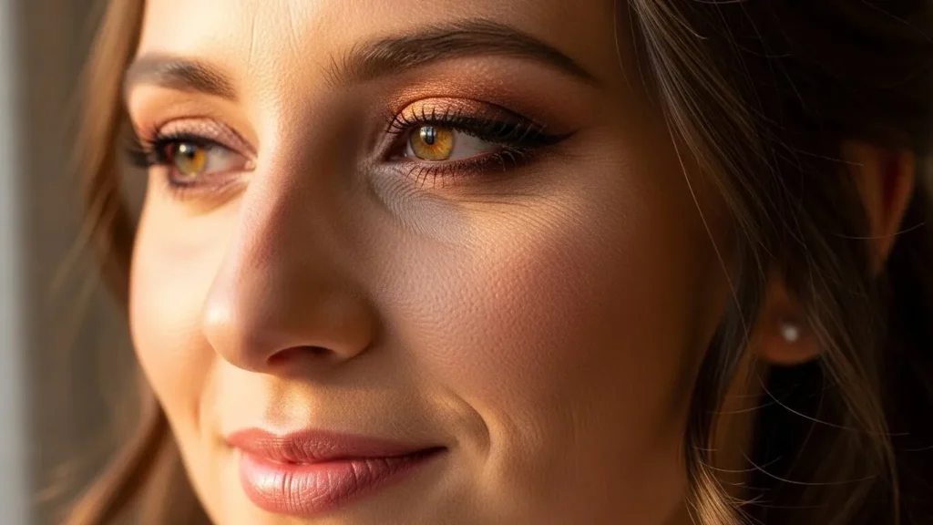 The eyes are softly sculpted with warm bronze tones that blend seamlessly into the skin. Her complexion looks radiant and smooth, with subtle highlight catching the golden light. The lips are understated and polished, keeping the focus on her eyes and profile.