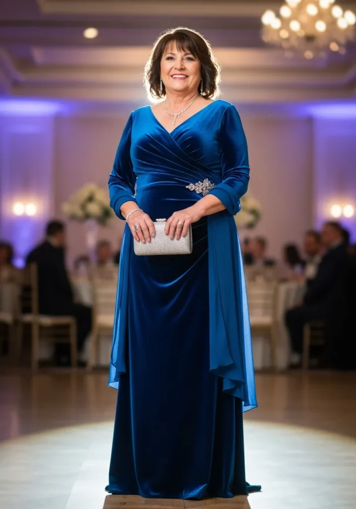 This look features a rich sapphire blue velvet gown with a wrap-style bodice, soft draping through the waist, and a flowing skirt that moves beautifully with every step. The fabric catches the warm ballroom lighting in a subtle way, giving the entire dress a luxurious glow that feels perfect for a black tie setting.