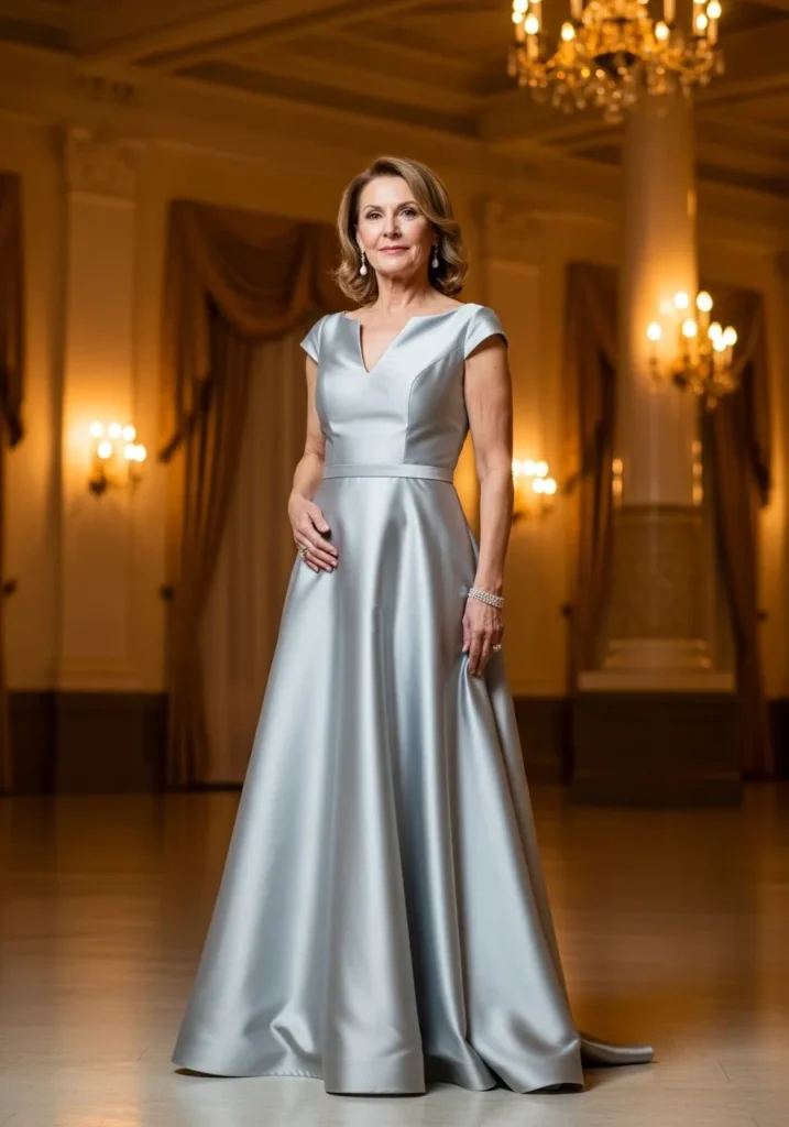 This silver satin gown showcases a structured bodice, clean seams, and a full flowing skirt that creates a striking silhouette under warm ballroom lighting. The smooth fabric reflects the light beautifully, giving the entire look a polished and luxurious finish.