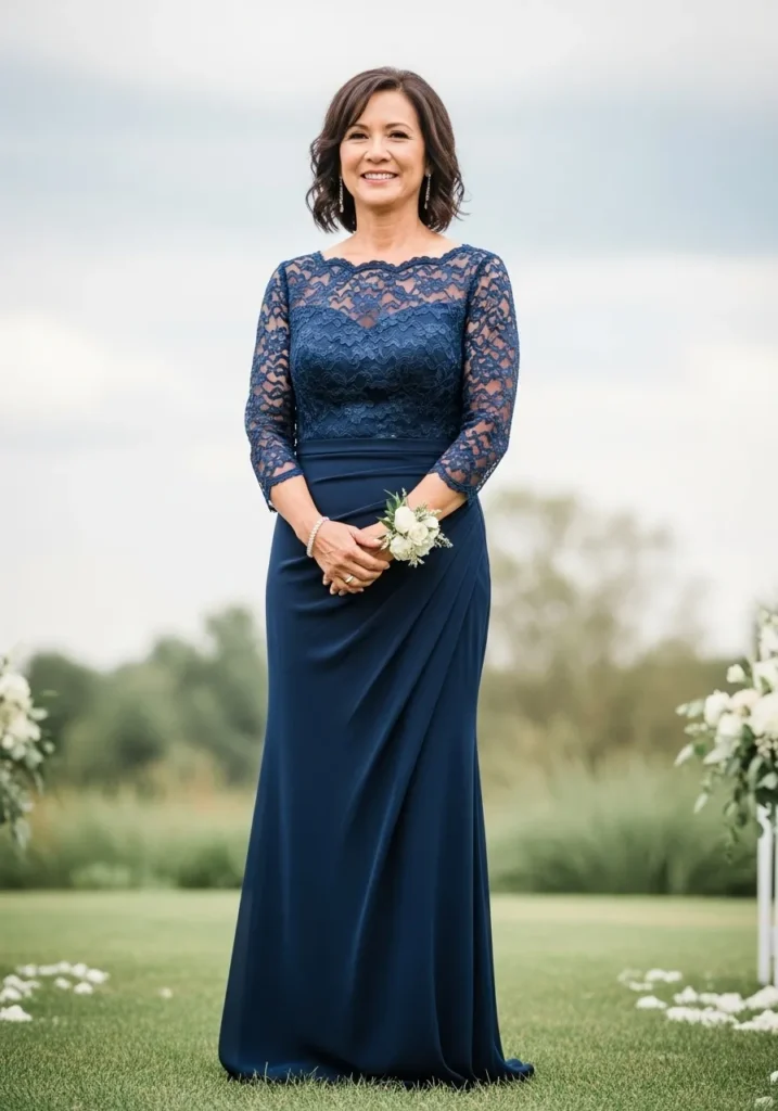 Some people love a look that feels refined and romantic, and this one checks all the boxes. I find the lace detailing so flattering and elegant, especially when paired with a rich navy tone that feels perfect for formal weddings.