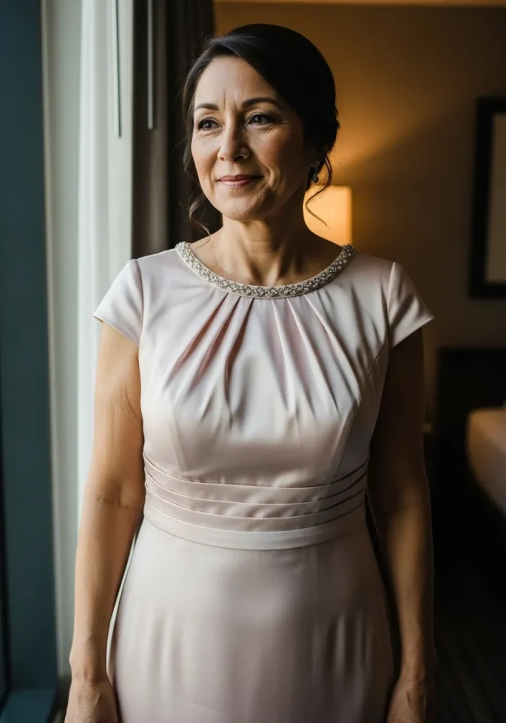 This gown features smooth champagne satin with a softly fitted bodice, gentle pleating, and a flowing skirt that moves gracefully with every step. The subtle sheen of the fabric reflects the warm hallway lighting, creating a refined and polished look.