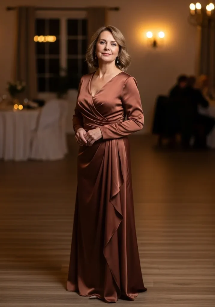 This copper satin gown showcases a wrap-inspired bodice, soft draping at the waist, and a flowing skirt that moves beautifully across the floor. The warm tone catches the ballroom lighting and adds depth to the overall look.