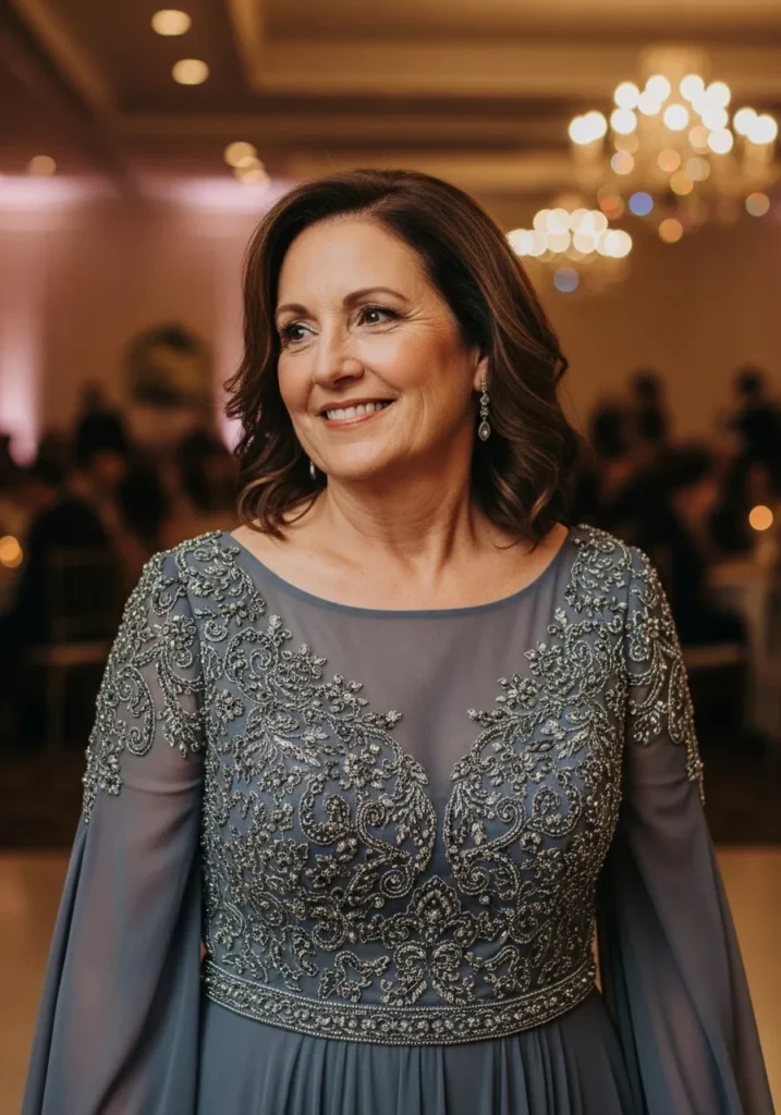 This gown features a sheer beaded bodice paired with soft flowing chiffon sleeves and a gently draped skirt. The delicate beadwork adds texture while the muted blue tone keeps the look soft and refined.
