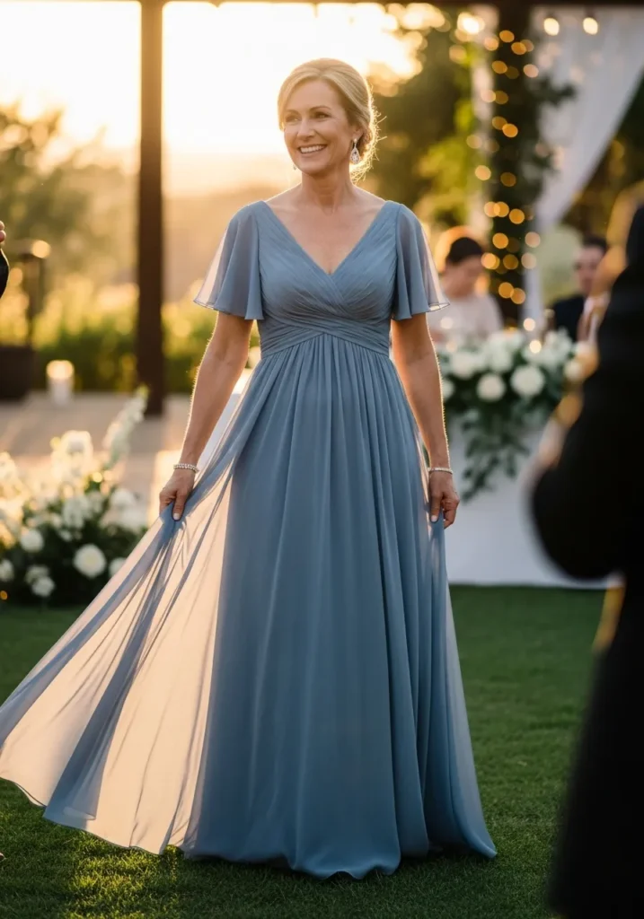 This dusty blue gown features a softly pleated bodice, gentle draping, and a flowing skirt that catches the golden light during sunset ceremonies. The airy fabric creates an effortlessly romantic silhouette.