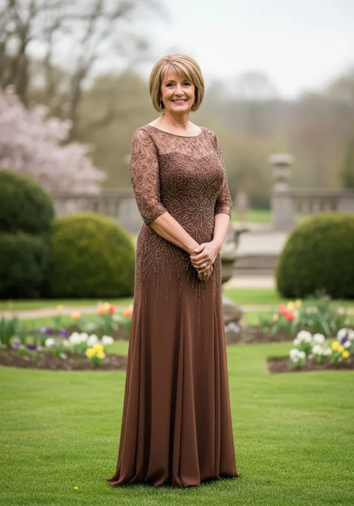 This gown pairs a delicate lace bodice with a flowing chiffon skirt in a warm mocha tone, creating a soft and graceful silhouette. The long sleeves add refinement while the gentle drape of the skirt keeps everything feeling light and airy against the garden backdrop.