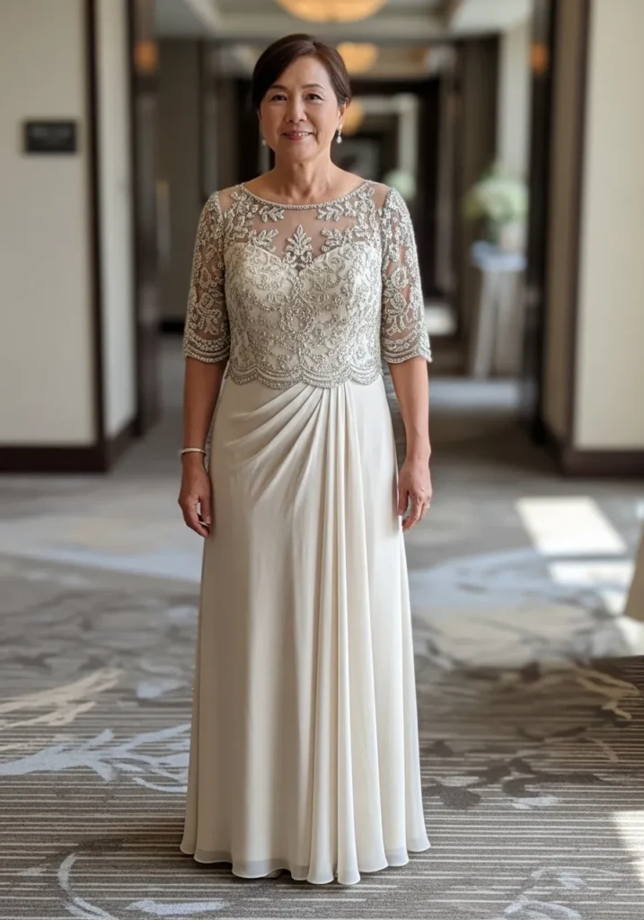 This gown features a delicately beaded bodice with sheer detailing and a softly pleated chiffon skirt that flows gracefully. The light ivory shade gives the entire look a refined and romantic finish.