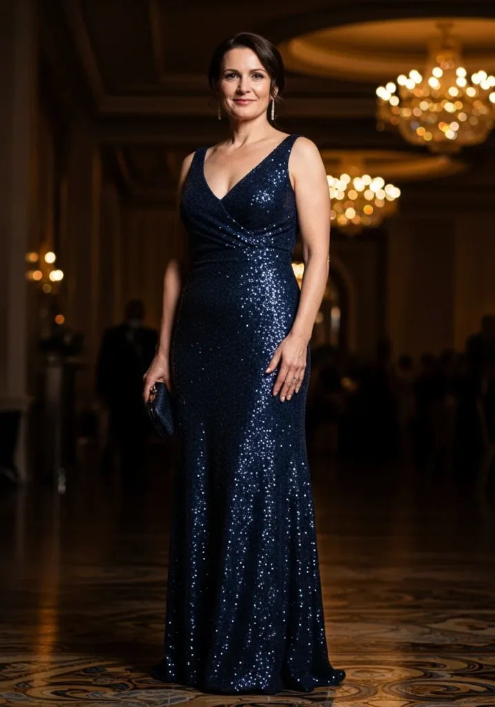 This stunning gown features deep navy sequins layered over a sleek, fitted silhouette with a flattering V neckline and gentle wrap detailing at the waist. The fabric catches the warm chandelier light beautifully, creating a soft sparkle that feels elegant rather than overpowering, while the floor-length cut adds a refined black tie finish.