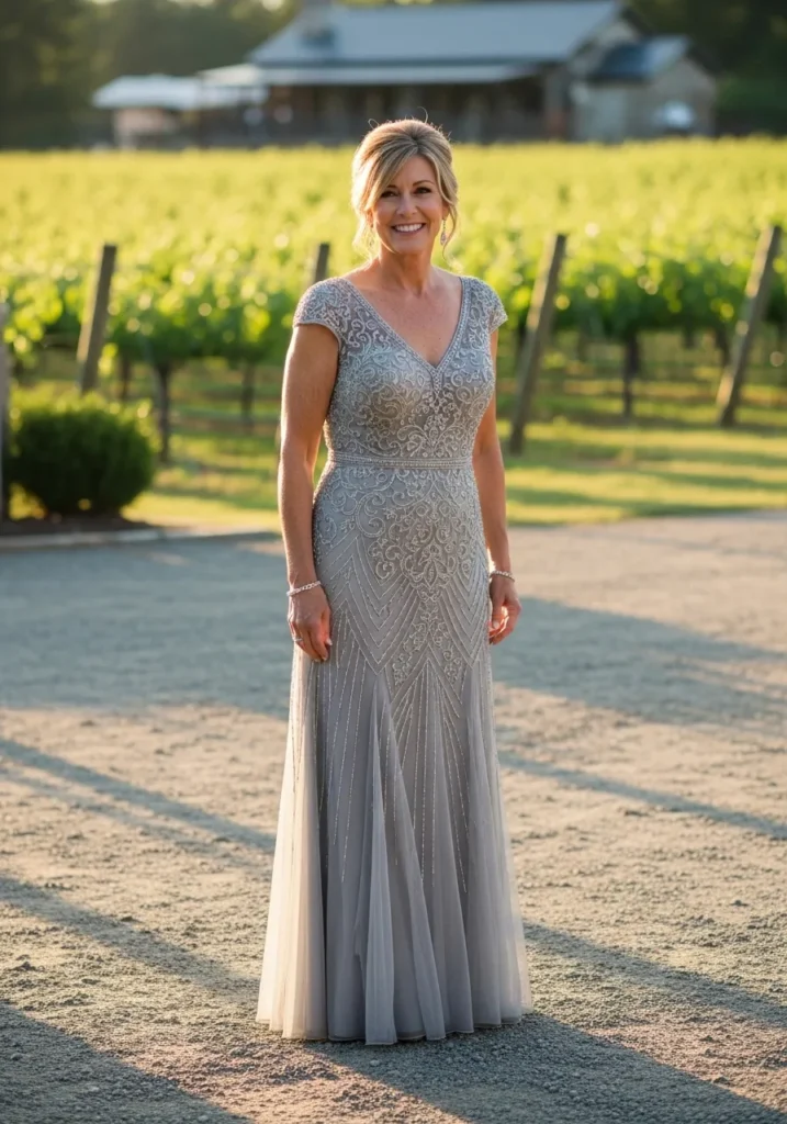This gown combines intricate beading with a softly fitted silhouette and a flowing skirt, creating a beautiful balance of structure and movement. The vineyard setting enhances the elegance while keeping the look grounded and romantic.