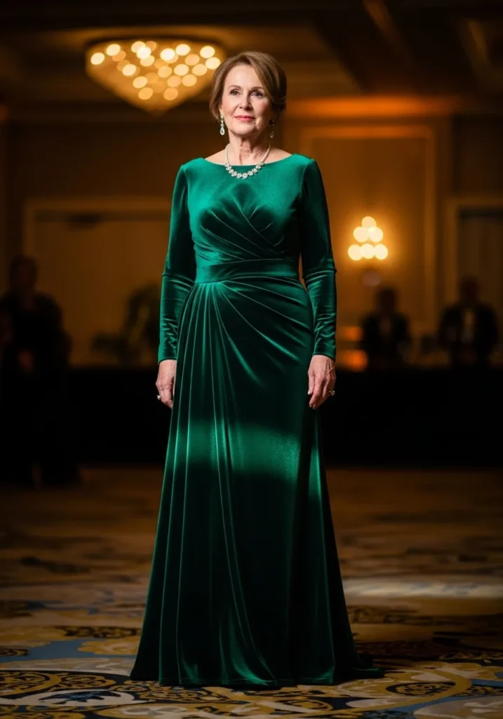 This striking emerald velvet gown features soft draping, long sleeves, and a beautifully fitted silhouette that glows under warm ballroom lighting. The rich fabric texture adds depth and drama, creating a truly statement-making look.