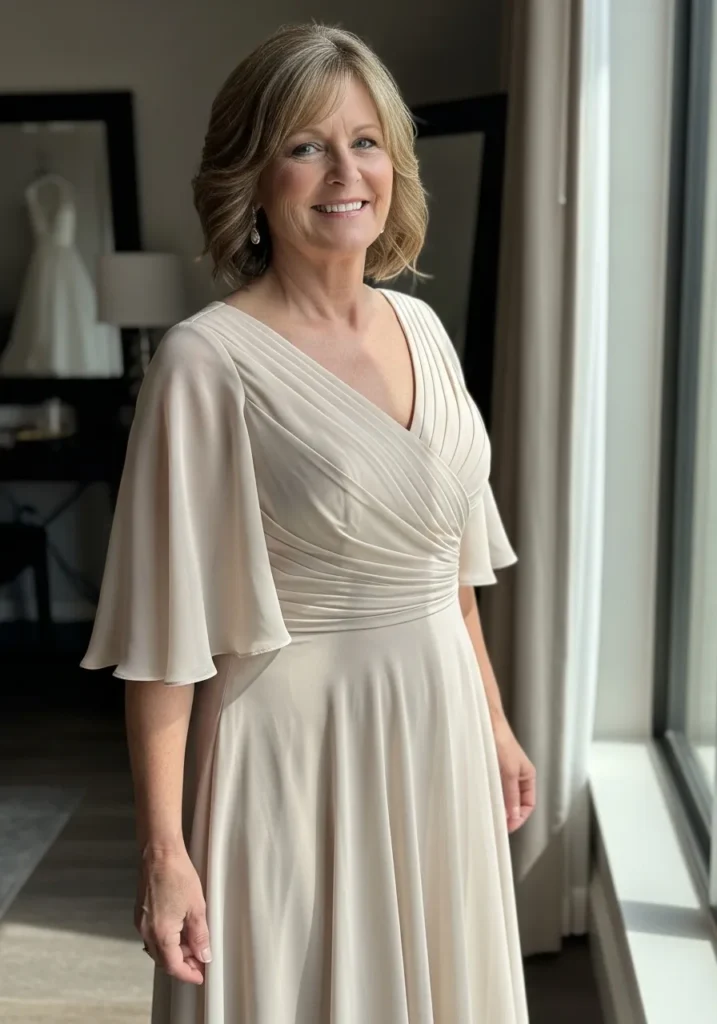 This gown features a flowing champagne chiffon fabric with soft flutter sleeves, gentle pleating, and a relaxed silhouette that drapes beautifully along the body. The lightweight fabric creates graceful movement, while the natural window light highlights the soft texture and subtle sheen.