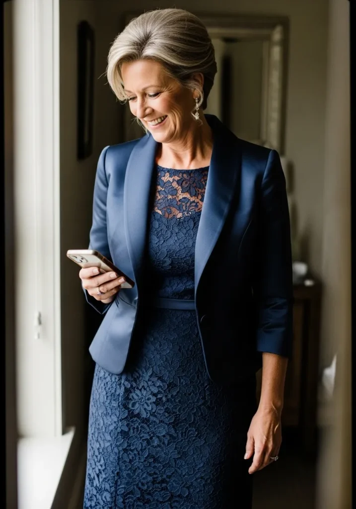 This look features a sophisticated older woman wearing a deep navy lace dress paired with a structured matching jacket, styled with soft makeup, natural hair texture, and simple accessories that keep everything polished yet effortless.