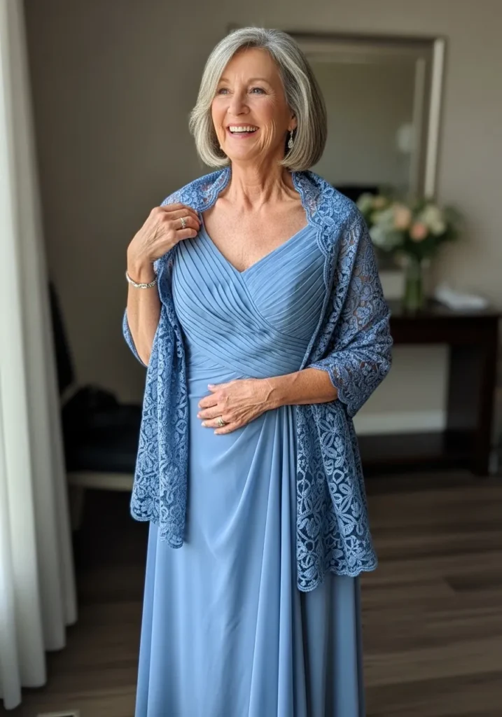 This outfit shows an older woman in a dusty blue chiffon gown styled with a soft lace shawl, captured indoors with warm lighting that enhances the gentle drape and airy feel of the fabric.