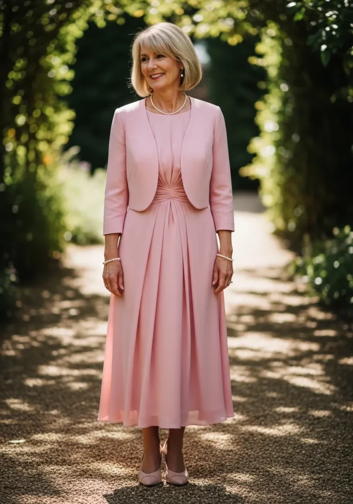 This image highlights a mature woman wearing a blush pink tea-length dress paired with a cropped tailored jacket, set along a leafy garden path with soft natural light and gentle shadows.