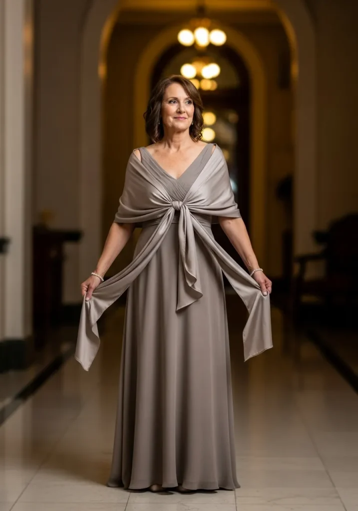This look features an older woman in a flowing taupe satin gown styled with a softly draped wrap, photographed inside an elegant hallway with warm ambient lighting that enhances the sheen of the fabric.