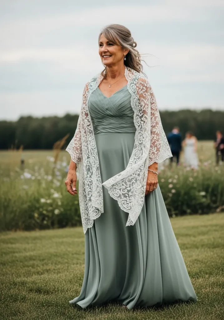 This outfit shows a mature woman wearing a sage green chiffon gown paired with a sheer lace shawl, photographed outdoors in a meadow setting with natural daylight and gentle breezes.