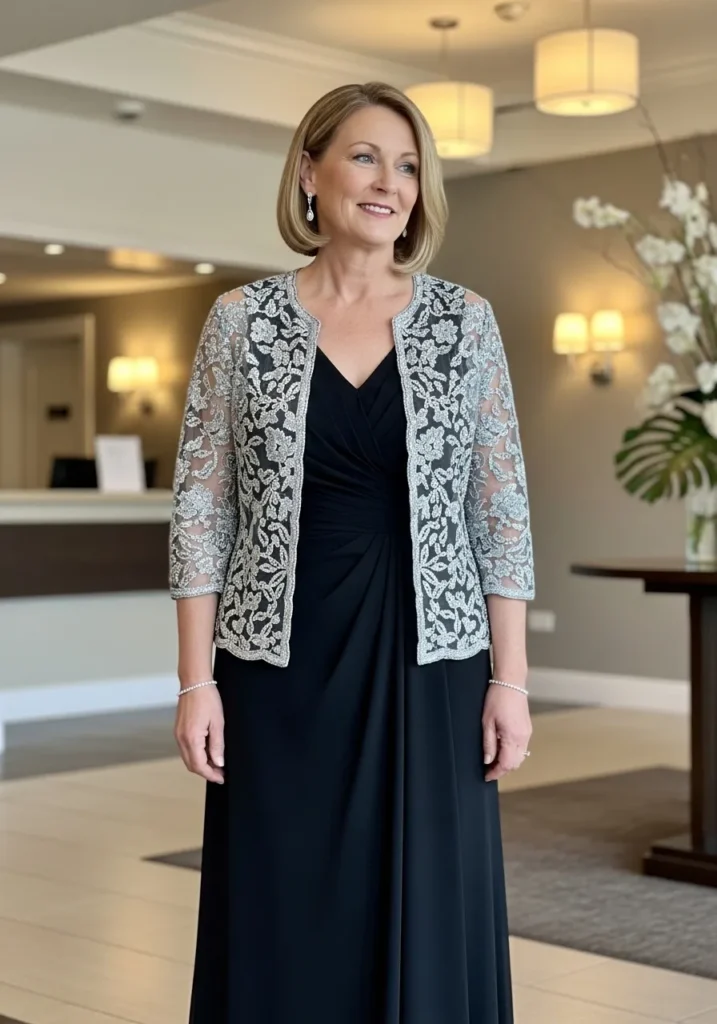 I love dresses with jackets or wraps because they instantly add sophistication while keeping things comfortable and practical, which is exactly the balance I always aim for when helping moms choose their wedding day look.