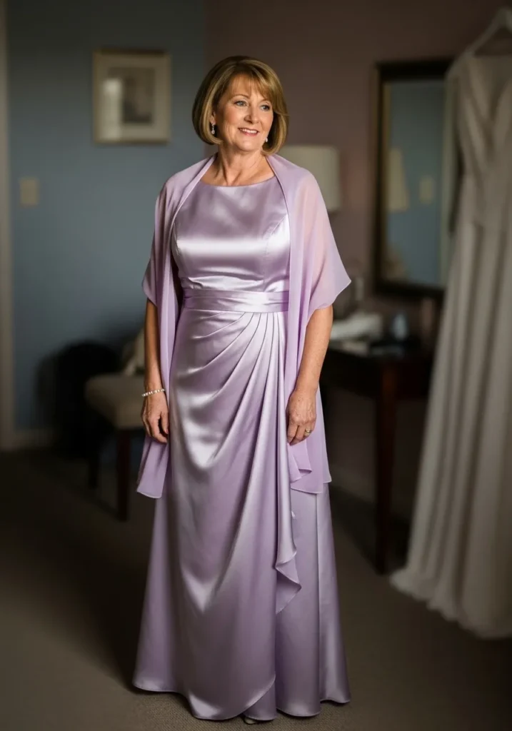 This look highlights a mature woman wearing a lavender satin gown paired with a soft flowing cape wrap, photographed in a bridal suite setting with warm lighting and subtle reflections.