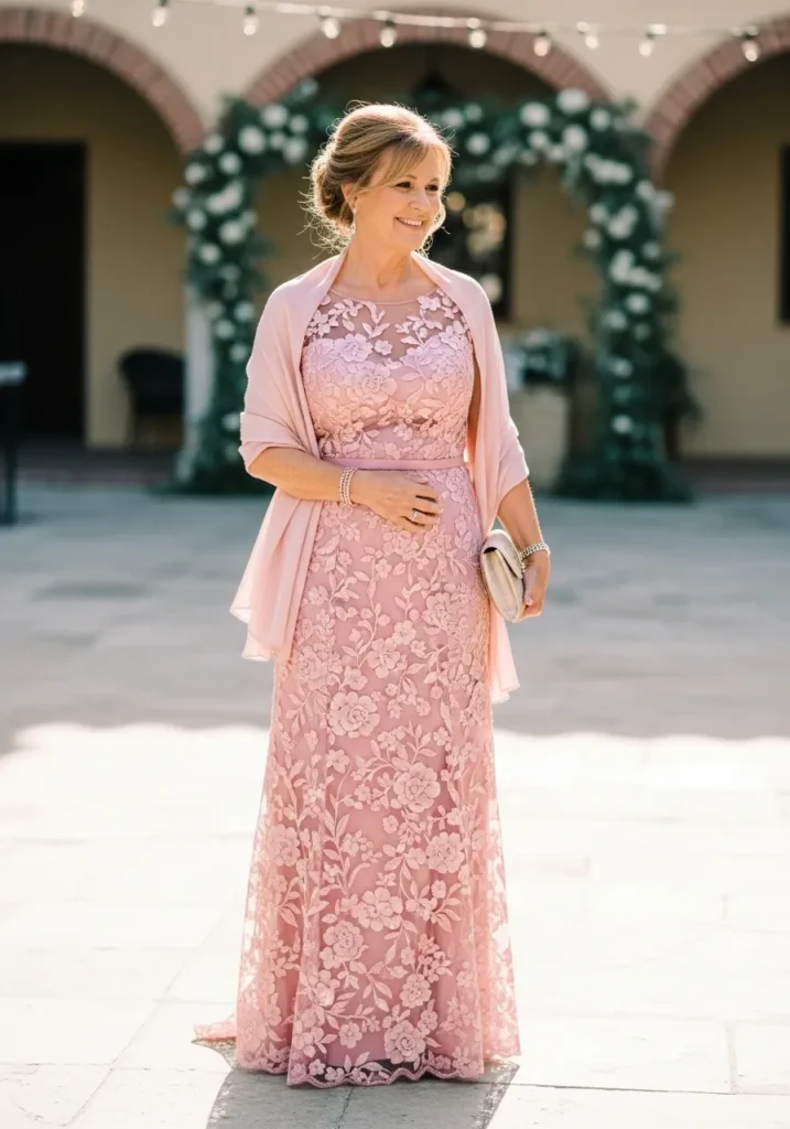 This outfit shows an older woman in a blush lace gown styled with a delicate chiffon jacket, captured in a sunlit courtyard with soft shadows and classic architectural details.