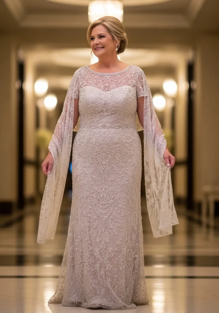 This image shows a mature woman in a champagne lace gown paired with a sheer lightweight wrap, styled indoors with soft lighting that highlights the delicate textures and embroidery.