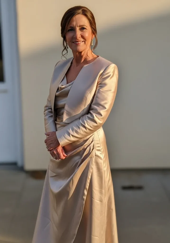 This image shows an older woman in a smooth golden satin gown styled with a perfectly fitted matching jacket, photographed in soft natural light that enhances the luxurious sheen and clean lines of the outfit.