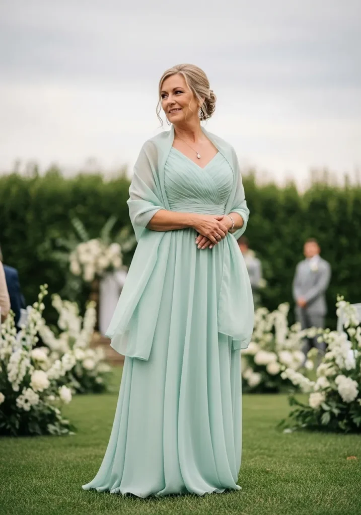 This outfit highlights a mature woman wearing a mint green chiffon gown paired with a draped coordinating wrap, set outdoors among garden floral and soft natural light.