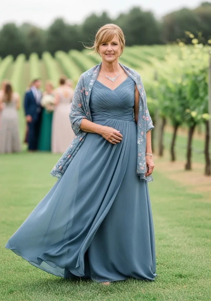 This outfit showcases a mature woman in a flowing dusty blue chiffon gown with a lightweight coordinating wrap, captured outdoors among vineyard rows with gentle natural light and soft movement in the fabric.