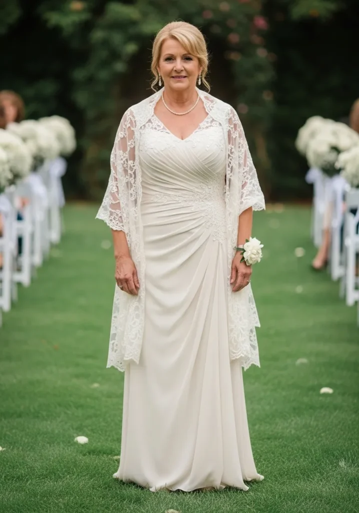 This look features an older woman in an ivory gown styled with a lightweight lace shawl, photographed outdoors along a wedding aisle lined with florals and soft greenery.