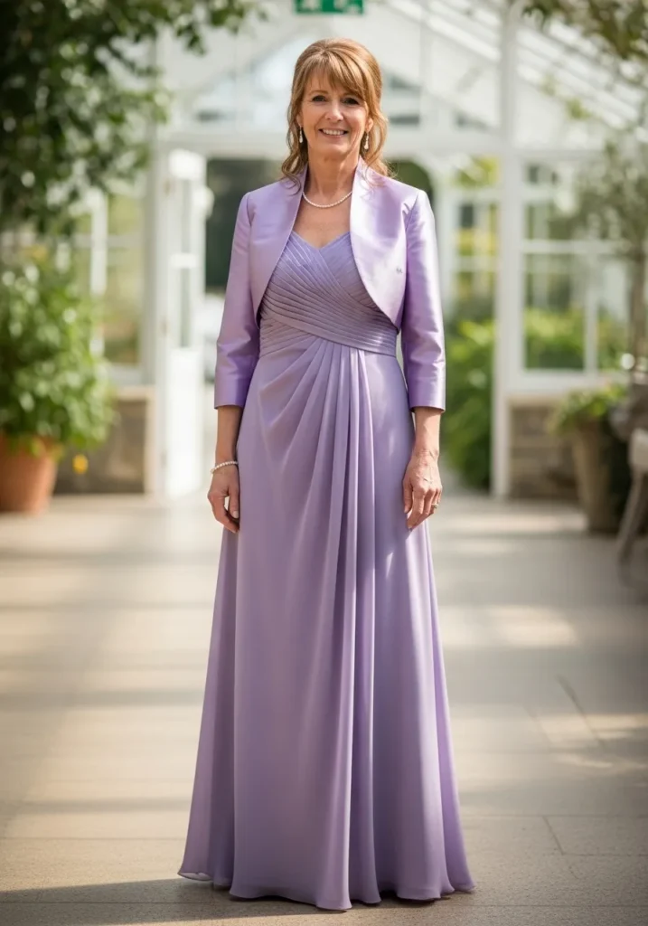 This look features a mature woman wearing a soft lavender chiffon gown with a matching cropped jacket, photographed in a bright greenhouse setting filled with greenery and natural light.