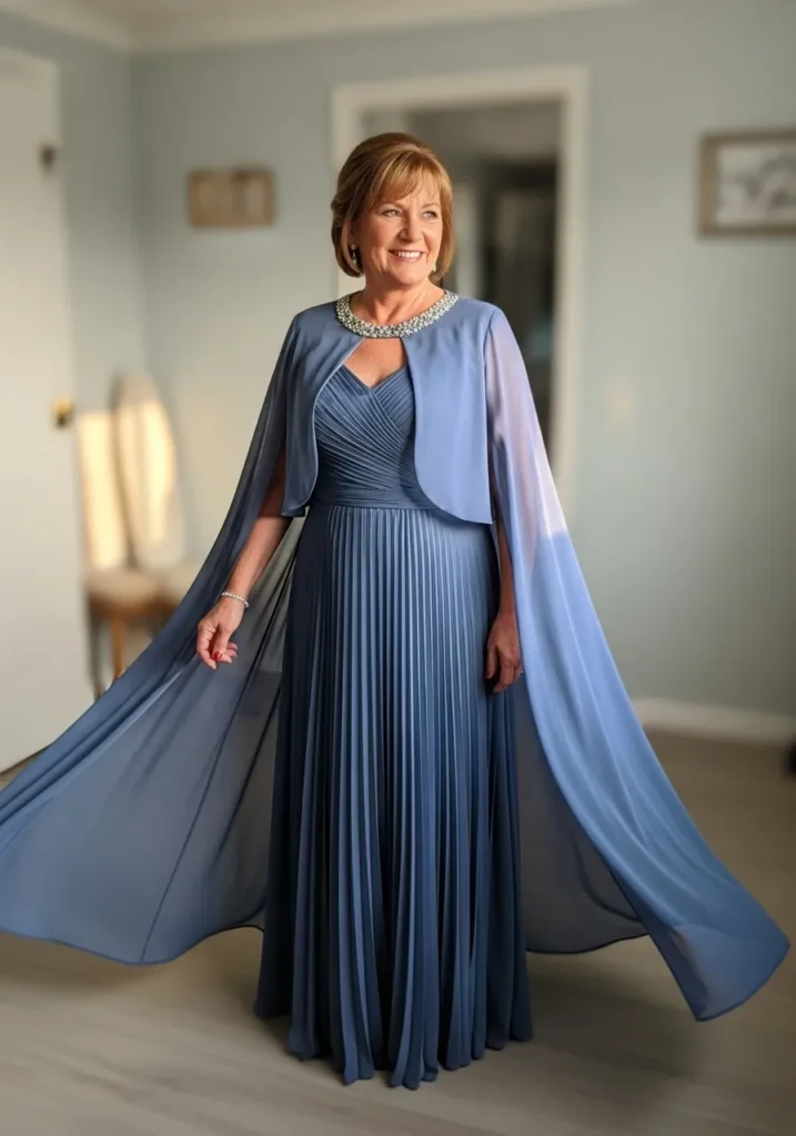 This photo features a mature woman wearing a deep blue pleated gown paired with a dramatic flowing cape-style wrap, styled indoors with soft lighting and gentle fabric movement.