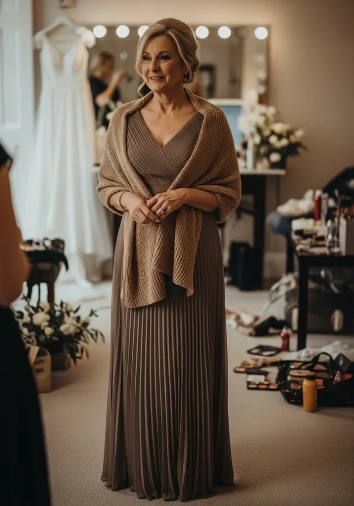 This look highlights an older woman in a pleated taupe gown styled with a soft textured shawl, photographed in a bridal suite setting with warm ambient lighting and relaxed details.