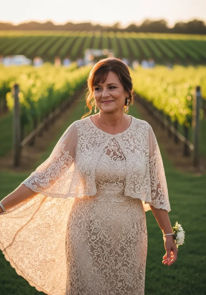 This look features a mature woman wearing a champagne lace gown paired with a sheer flowing wrap, photographed among vineyard rows in warm golden light that highlights the delicate textures and soft movement of the fabric.