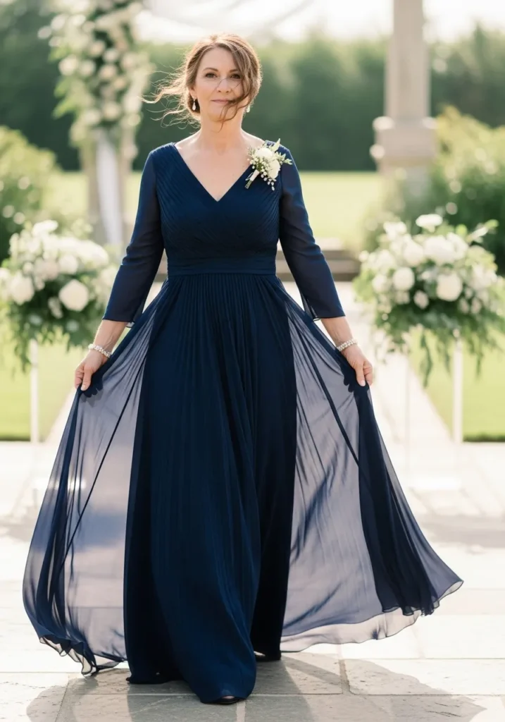 This look features a long navy chiffon gown with a softly pleated skirt and a flattering V neckline that feels both timeless and graceful. The lightweight fabric moves beautifully with every step, creating natural flow and gentle volume, while the tailored bodice keeps the silhouette polished and refined.