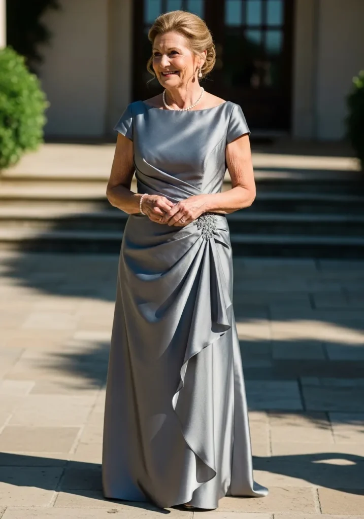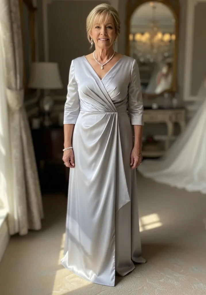 This silver satin gown showcases a wrap-style bodice, gentle draping, and a sleek floor-length silhouette that feels clean and sophisticated. The subtle shine of the fabric reflects light beautifully, giving the entire look a soft and luminous finish.
