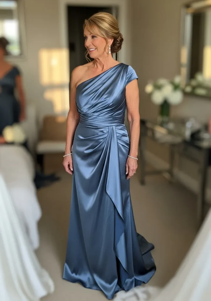 This steel blue satin gown features a one-shoulder neckline, soft ruching, and a sleek floor-length skirt that creates a flattering and elegant silhouette. The smooth fabric reflects light beautifully, giving the look a polished and contemporary finish.