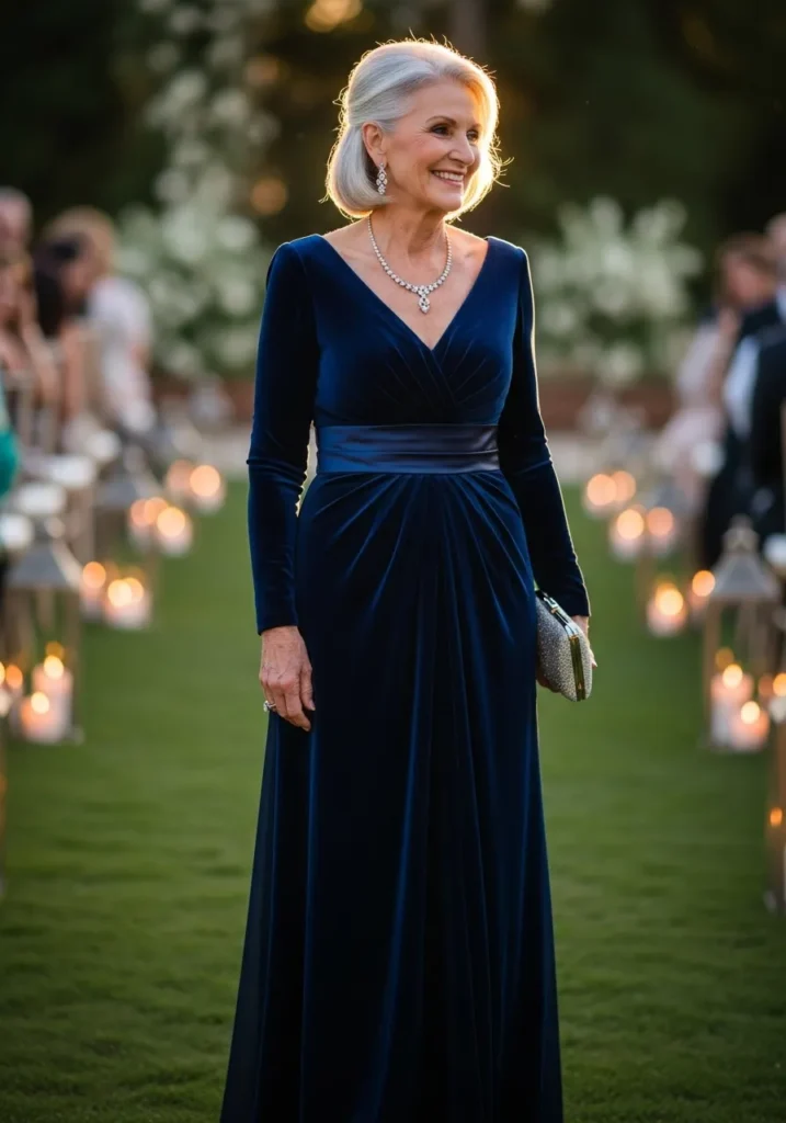 This midnight blue velvet gown features a softly wrapped bodice, long sleeves, and a flowing floor-length skirt that drapes beautifully with each step. The rich fabric catches the soft glow of surrounding lights, creating a warm and elegant effect that feels perfect for evening celebrations.
