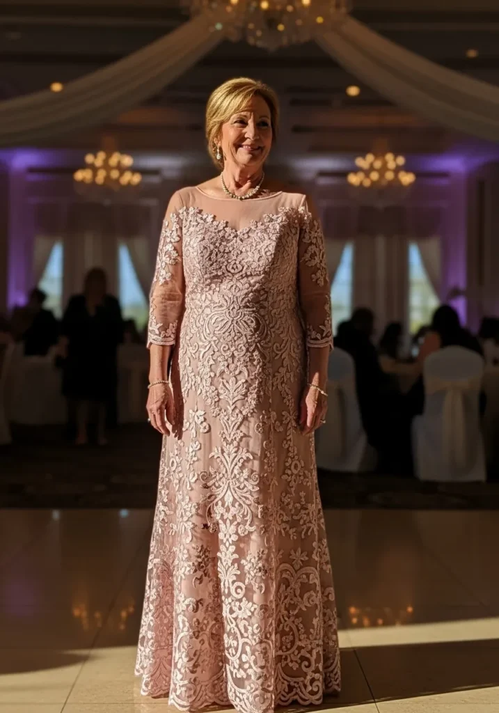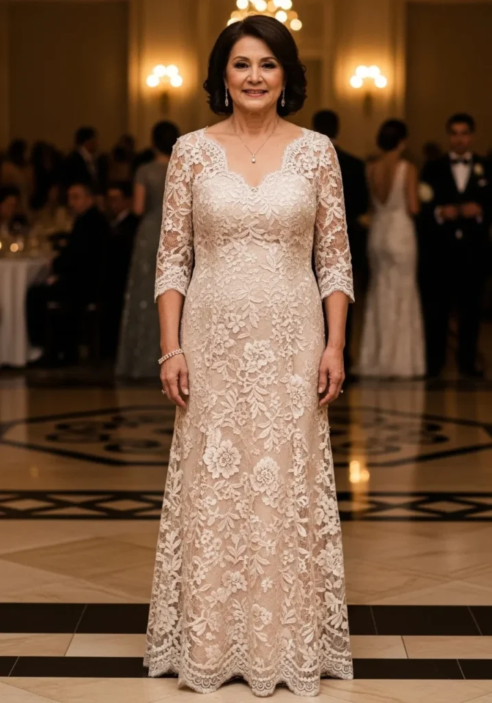 I find this style absolutely captivating for black-tie celebrations where you want to look polished yet approachable. The lace detailing feels luxurious without being overwhelming, and the soft champagne color makes everything feel warm, flattering, and incredibly special.