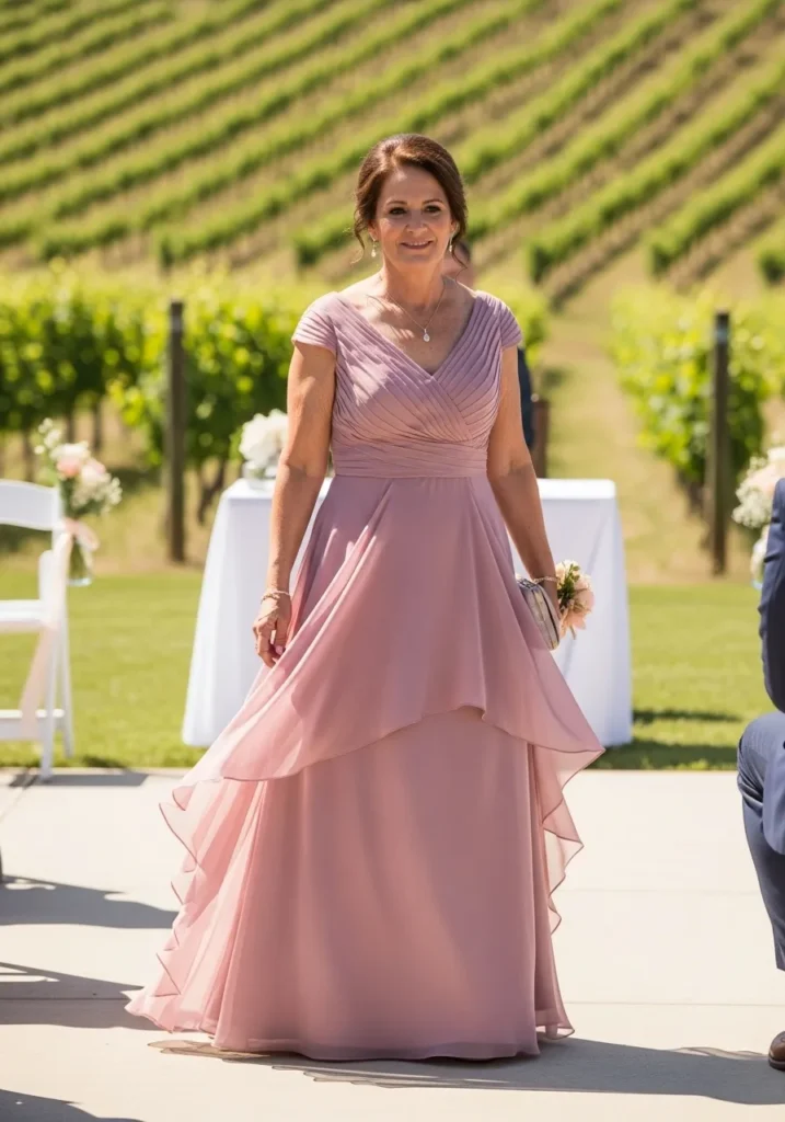 This blush-toned gown features a clean bodice, flowing chiffon skirt, and soft movement that feels light and airy. The gentle color paired with the relaxed silhouette creates a romantic look that fits beautifully into an outdoor vineyard setting.